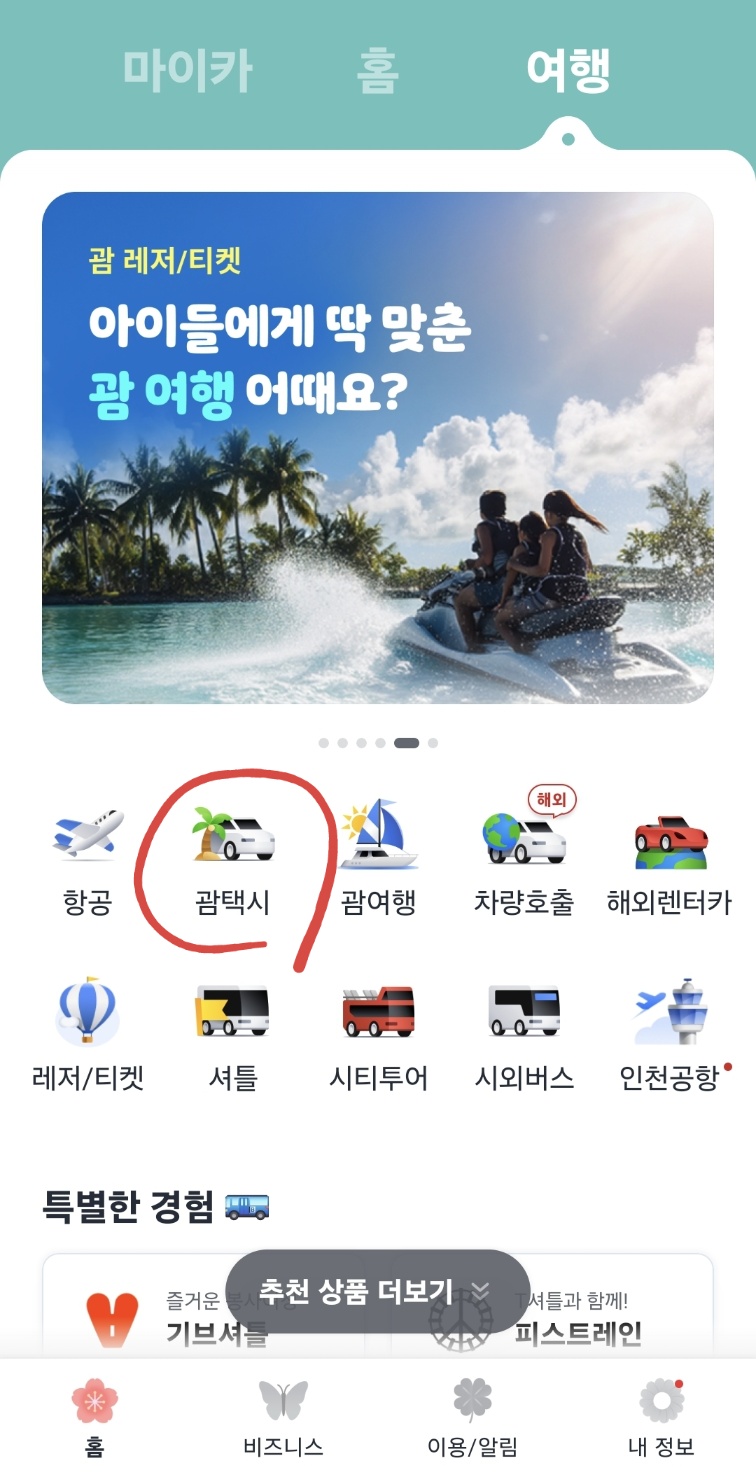 카카오T 택시는 카카오T 앱에서 우측 상단 '여행' 탭에 들어간 후, '괌택시' 메뉴를 선택하면 되는데요.