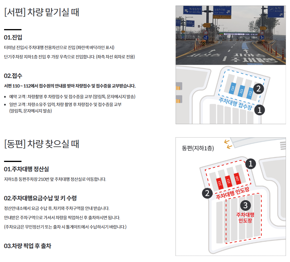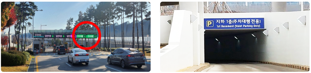 주차대행 서비스는 사전에 예약을 하면 누구나 쉽게 이용할 수 있는데요. 장기 주차장이나 일반 주차장으로 들어오는 것이 아닌 '주차 대행'이라고 표시되어 있는 곳을 따라 이동하시면 된답니다.