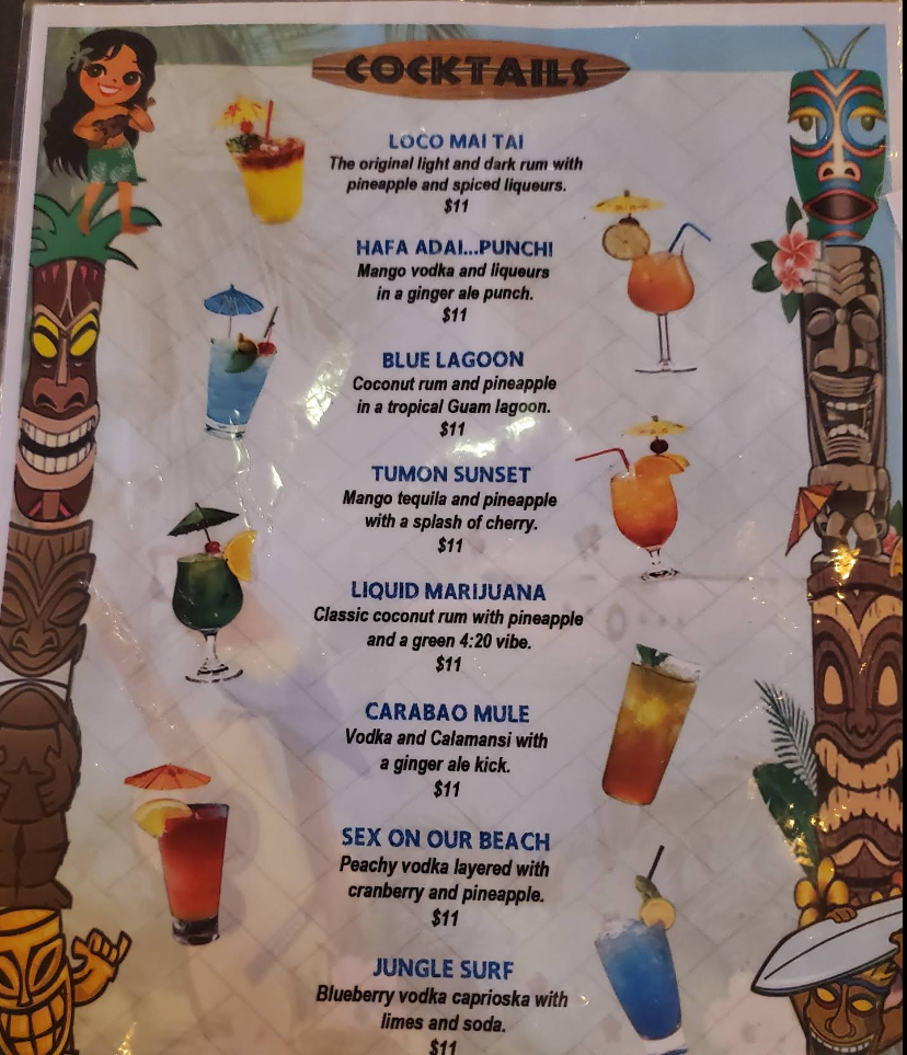 저희는 이것저것 골고루 먹고 싶어서 'LOCO MAI TAI' , 'TUMON SUNSET', 'BLUE LAGOON', 'JUNCLE SURF' 이렇게 4가지를 주문해 봤어요. (사진에는 없지만 메뉴 중 XXX라고 되어 있는 메뉴 속 칵테일이 도수가 세고 단 맛이 적은 칵테일이니 참고하세요!)