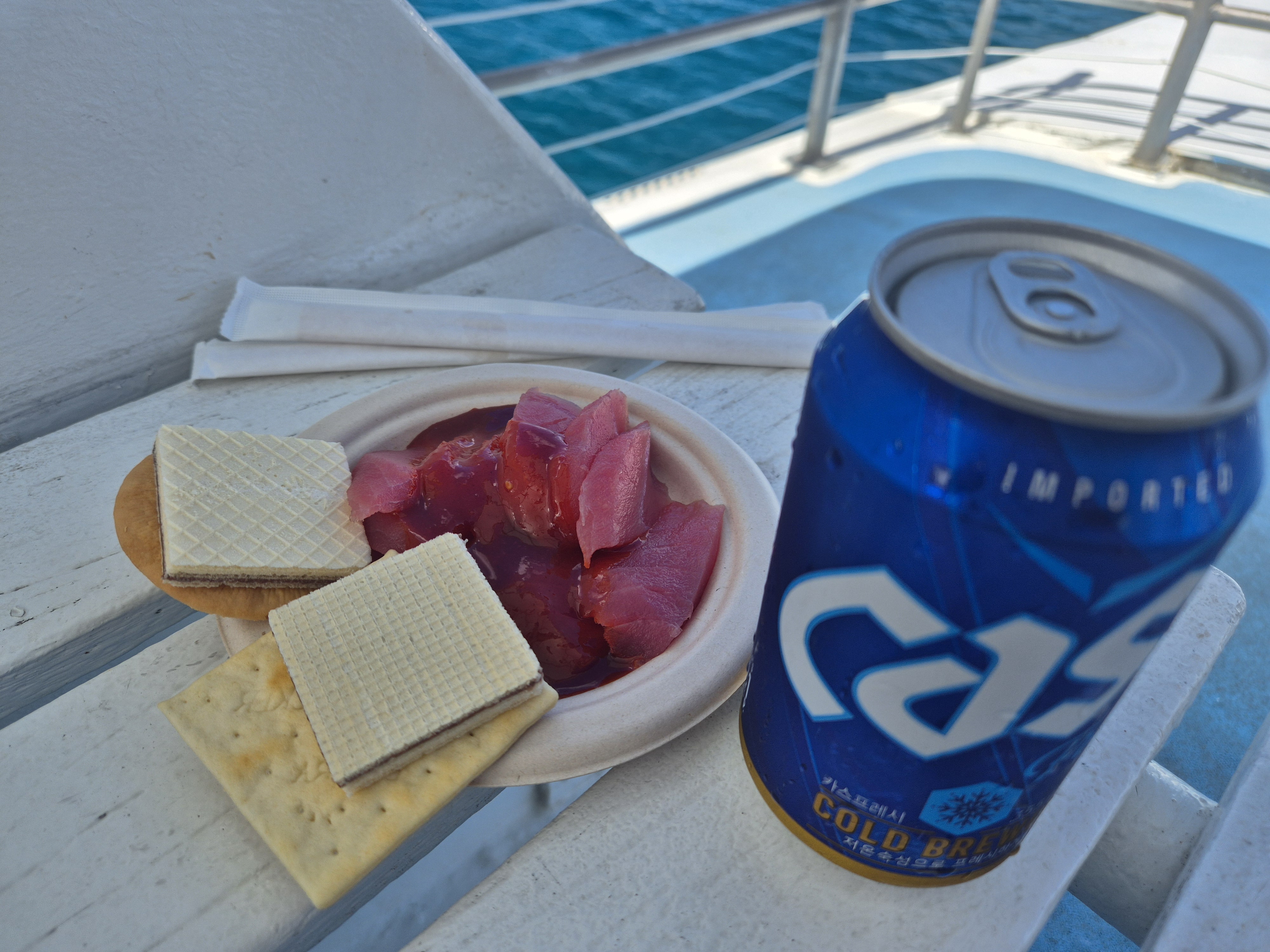 참치회와 간단한 과자, 맥주 등 주전부리도 있어서 스노클링 후 허기진 배도 채울 수 있었죠. 어제 스노클링을 제대로 하지 못해 다소 아쉬웠는데 정말 원 없이 스노클링을 했던 것 같아요.