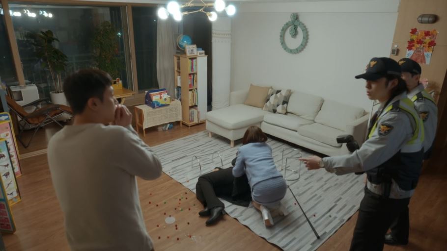 주란과 남편 재원의 다툼이 이어지고 재원은 홧김에 주란을 밀어버립니다. 주란은 유리테이블이 있던 자리로 넘어지죠. (지원이 미리 부수지 않았으면 지원과 똑같이 테이블에 머리를 부딪혀 죽었을 상황) 이를 본 지원은 화가 나 재원에게 달려들고 결국 주란과 지원은 경찰서에 가게 됩니다.