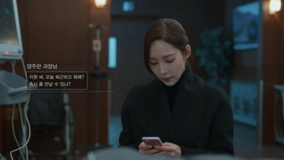 병원으로 다시 돌아온 지원은 양주란 과장으로부터 남편이 바람을 피운다는 사실을 전해 듣게 됩니다. 문자를 본 지원은 자신의 운명이 수민이 아닌 주란에게 향한 것에 대해 의문을 가지게 되죠.