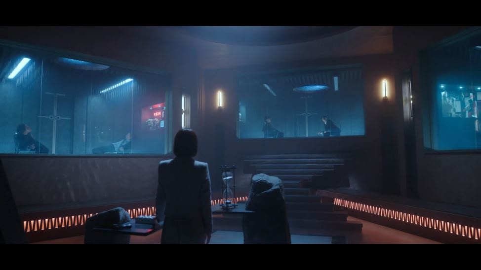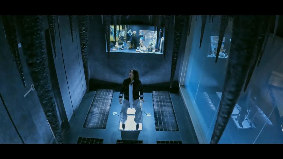 감옥 문이 열리고 라희는 중앙 통제실에서 악인들을 지켜봅니다. 라희가 버튼을 누르고 악인들의 방 천장에서 날카로운 가시 함정이 내려오기 시작하죠.