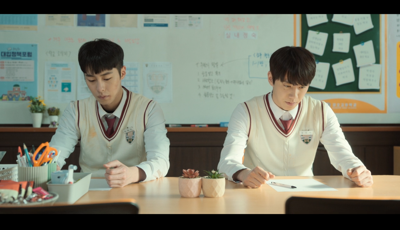 다음날 태오는 인하의 반으로 전학을 옵니다. 태오는 모의고사 전국 0.1% 수재로 학교에서 큰 주목을 받게 되죠. 인하는 그런 태오가 못마땅해 그를 쫓아다니며 시비를 겁니다.