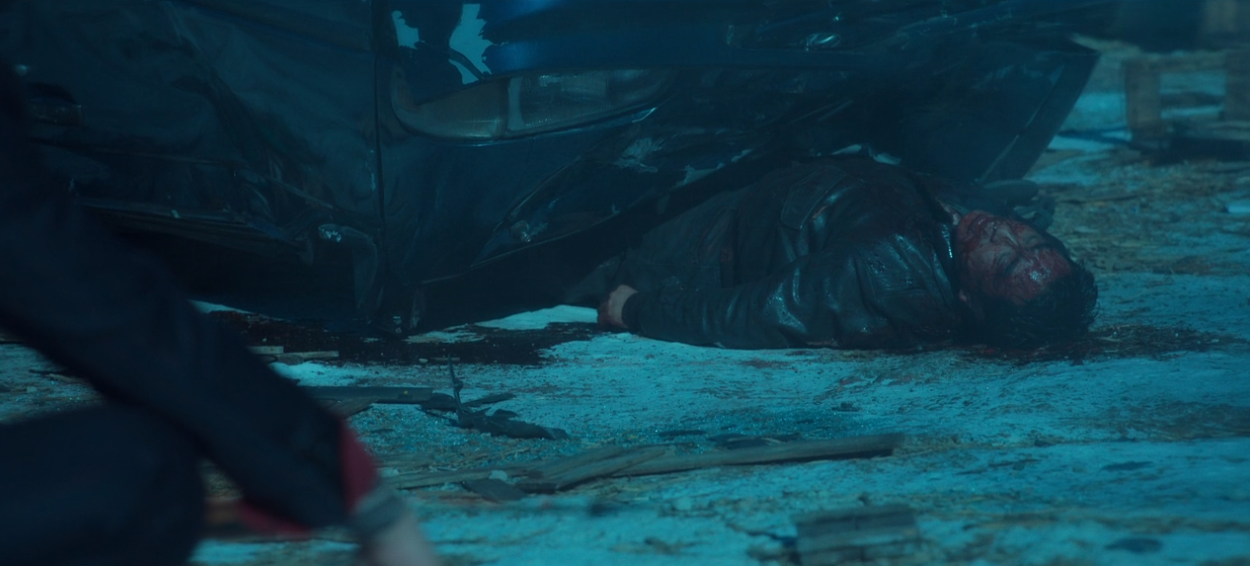 차에 깔려 고통스러워하는 주원에게 민기가 다가옵니다.(그는 재생능력은 있지만 고통은 그대로 느끼기에 심한 부상에는 회복의 시간이 필요합니다) 정신을 잃어가는 주원을 보며 민기는 작살총을 들고 주원을 죽이려고 하죠.