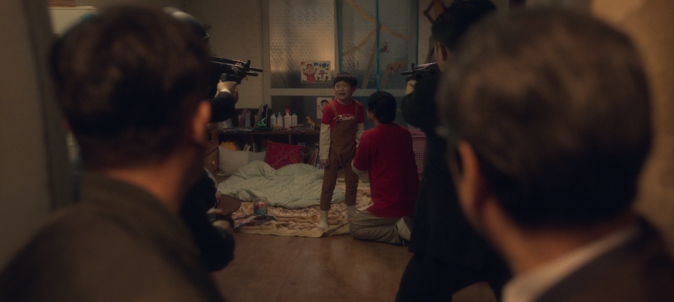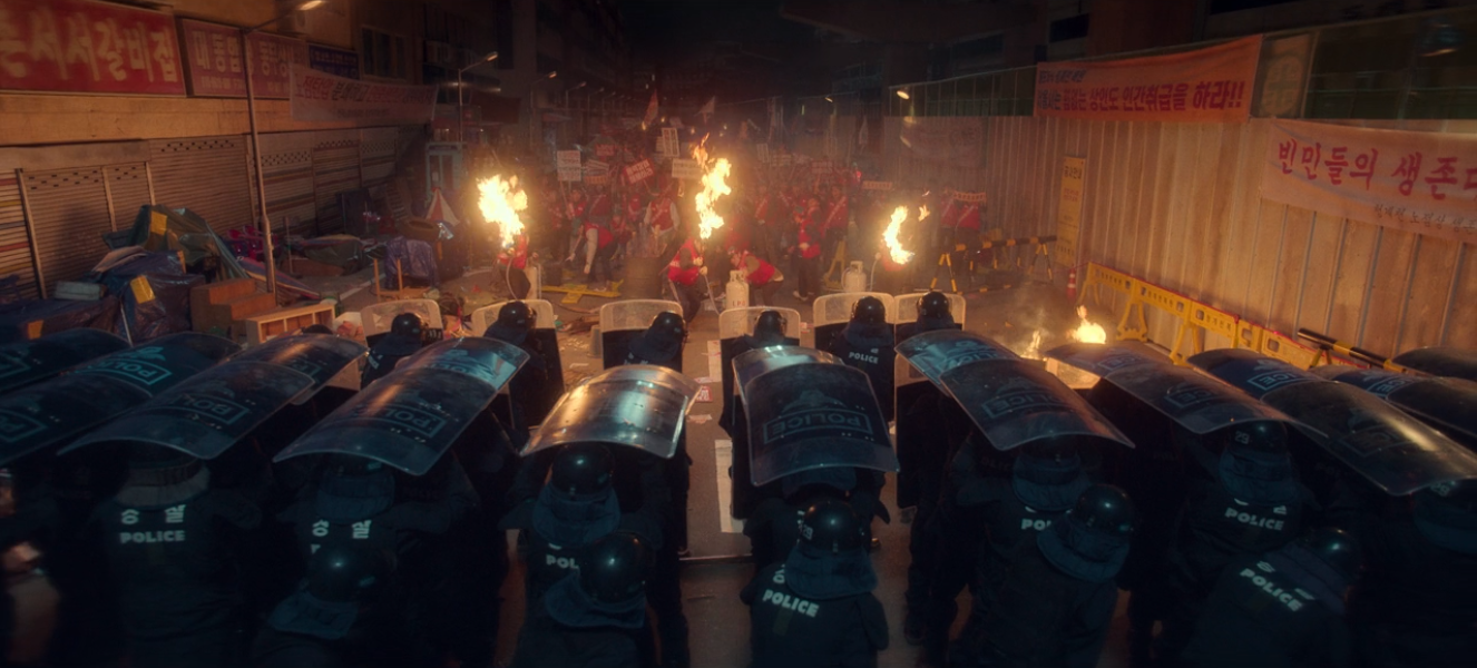 늦은 밤, 경찰들은 시위를 진압하기 시작합니다. 결국 시위는 갑자기 시위 현장을 급습한 용역과 경찰들에 의해 무산됩니다. 주변 상가는 모두 부서지고 시위에 참여한 상인들은 모두 경찰에 끌려가게 되죠. 재만은 비도 오는데 밤늦게까지 아내가 돌아오지 않자 걱정이 됩니다. 그래서 강훈에게 밤 10시까지 꼭 돌아오겠다며 약속하고 아내를 찾으러 밖으로 나갑니다.