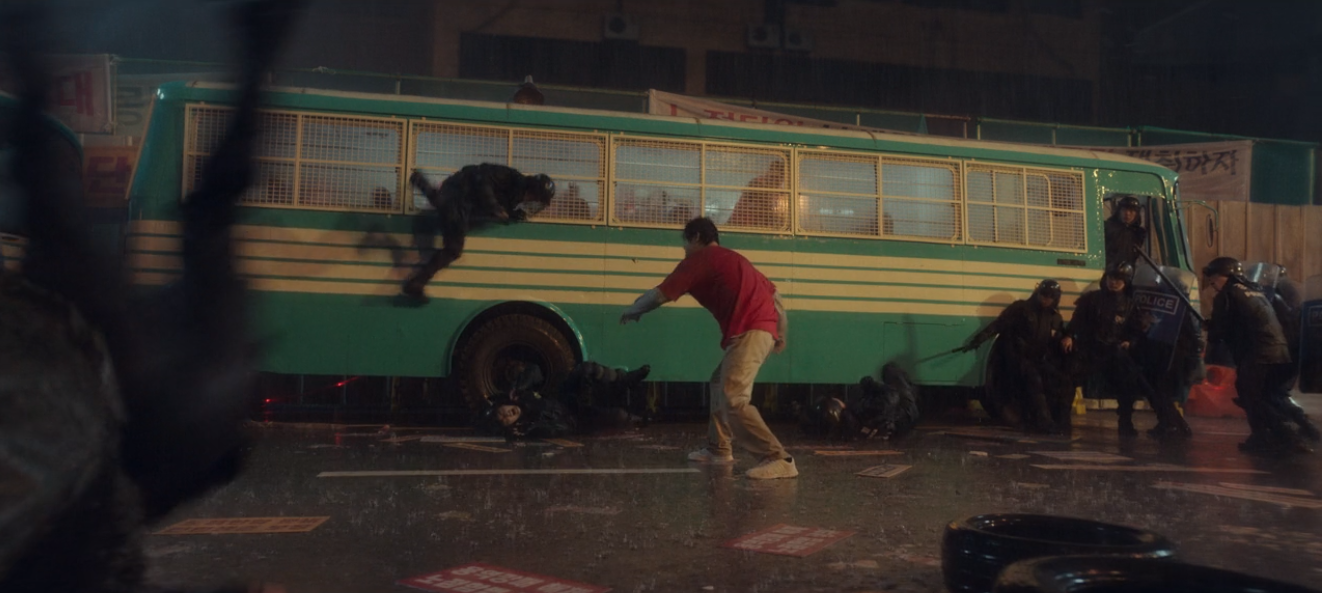 그렇게 청계천으로 온 재만은 경찰 버스에 체포된 아내를 보게 됩니다. 이에 이성을 잃고 아내를 구하기 위해 경찰들에게 달려듭니다. 전경 한 개 중대를 모두 박살내고 강력한 물대포를 맞고도 호송용 차량에 붙은 쇠창살을 뜯어내는 괴력을 보이죠. 그러나 강훈을 생각하라며 도망가라고 외치는 아내를 보고 결국 경찰들을 피해 하수도로 도주합니다.