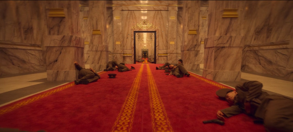두식은 병사들이 죽지 않게 모두 가슴 쪽을 쏘았으니 빨리 조치하면 살 수 있을 것이라고 말합니다. 덕윤은 제발 부탁이니 들어가지 말아 달라고 애원하죠. 쓰러졌던 덕윤이 총을 들자 뒤돌아 덕윤의 손을 쏴 오른손 검지 손가락이 절단됩니다. 결국 두식은 문을 열고 김일성에게 총구를 겨누죠. 하지만 자신이 죽이지 않아도 곧 죽을 상태인 것을 눈으로 확인하자 이내 거두고 돌아갑니다.