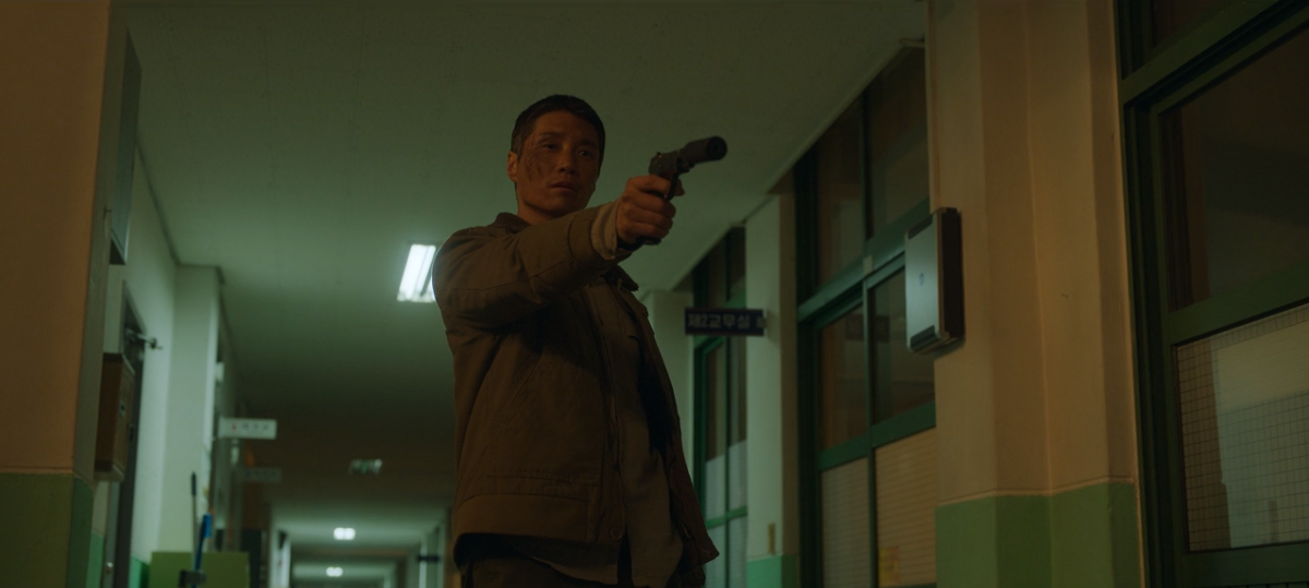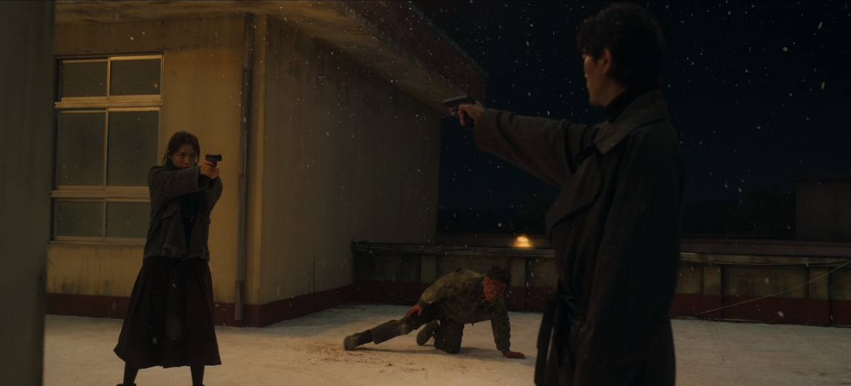 창문으로 우회해 재학을 쏜 미현. 재학은 결국 죽고 미현은 일환과 기수에게 도망가라고 말합니다. 하지만 일환은 기수만 집으로 돌아가라고 말하고 재학의 총을 주워 북한요원들을 쫓죠.