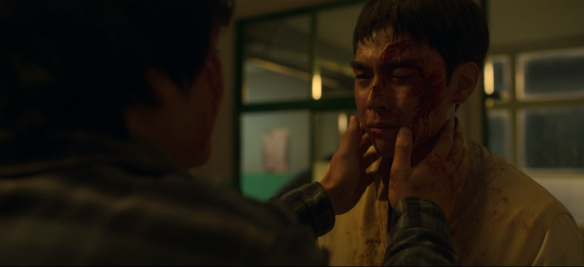 한편 희수는 학교로 달려가는 도중 경찰을 피해 숨어 있는 용득을 발견합니다. 피투성이가 된 채 하염없이 울고 있는 용득을 그냥 지나칠 수 없었던 희수는 용득을 달래줍니다.