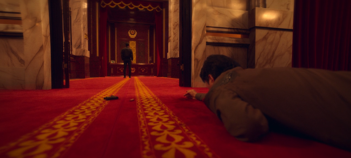두식은 병사들이 죽지 않게 모두 가슴 쪽을 쏘았으니 빨리 조치하면 살 수 있을 것이라고 말합니다. 덕윤은 제발 부탁이니 들어가지 말아 달라고 애원하죠. 쓰러졌던 덕윤이 총을 들자 뒤돌아 덕윤의 손을 쏴 오른손 검지 손가락이 절단됩니다. 결국 두식은 문을 열고 김일성에게 총구를 겨누죠. 하지만 자신이 죽이지 않아도 곧 죽을 상태인 것을 눈으로 확인하자 이내 거두고 돌아갑니다.