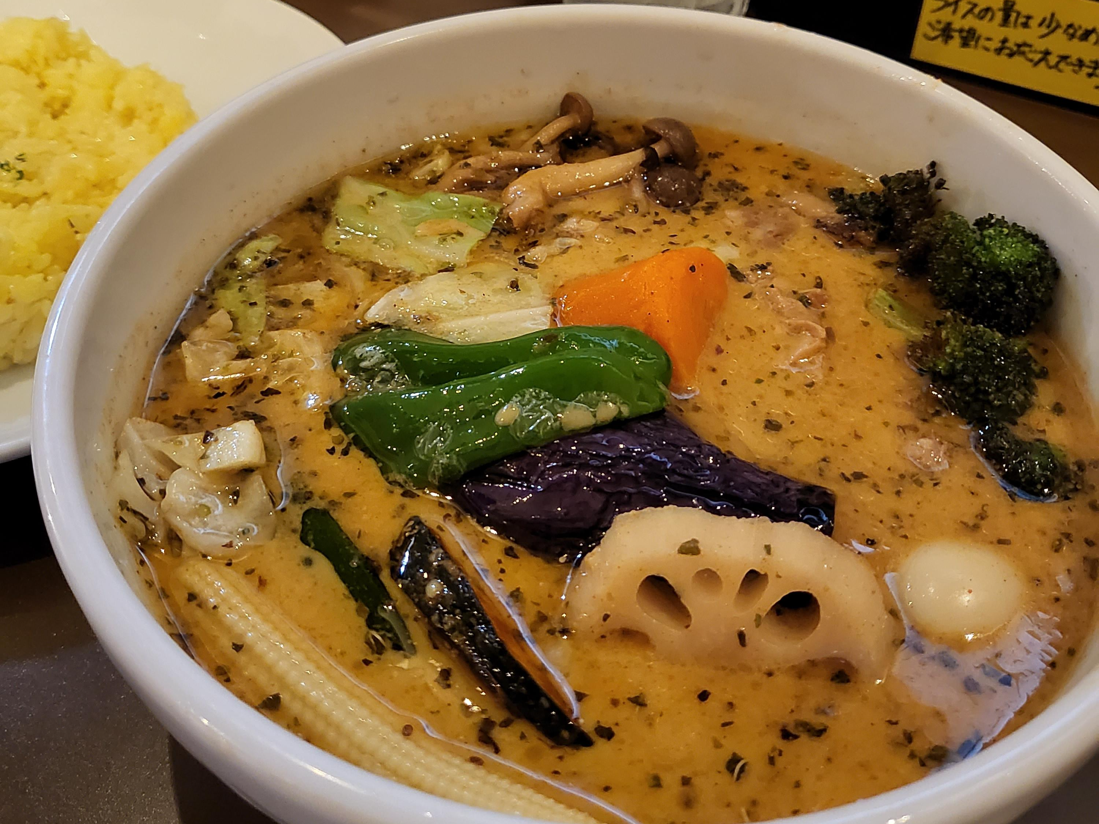 제가 주문한 건 치킨 야채 커리였는데요. 수프카레 킹에서는 매운맛 단계를 조절할 수 있고 밥 추가, 수프 추가 옵션도 선택할 수 있답니다. 매운맛은 0단계부터 조커단계까지 15단계로 이뤄져 있는데 6단계부터는 추가요금을 받고 있으니 참고하시면 좋을 것 같네요. (저는 매운 것을 잘 먹지 못해 2단계를 선택했어요) 카레 양은 생각보다 많았고 야채도 푸짐해 정말 배부르게 먹었답니다. 우리가 생각하는 카레 느낌과는 전혀 다른 느낌인데 칼칼하고 시원한 국물 맛이 일품이라 삿포로에 오시면 수프카레는 꼭 드셔보는 걸 추천드려요.