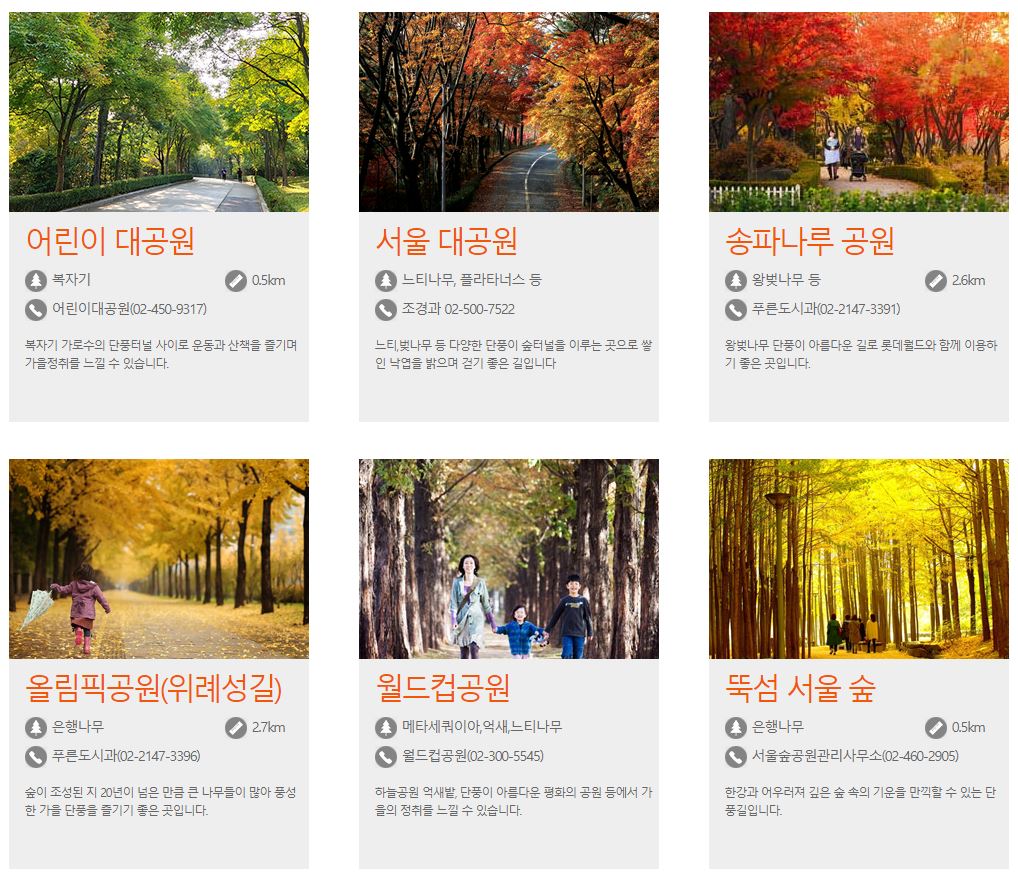 올림픽 공원(위례성길) (2.7km) : 숲이 조성된 지 20년이 넘은 만큼 큰 나무들이 많아 풍성한 가을 단풍을 즐기기 좋은 곳입니다.