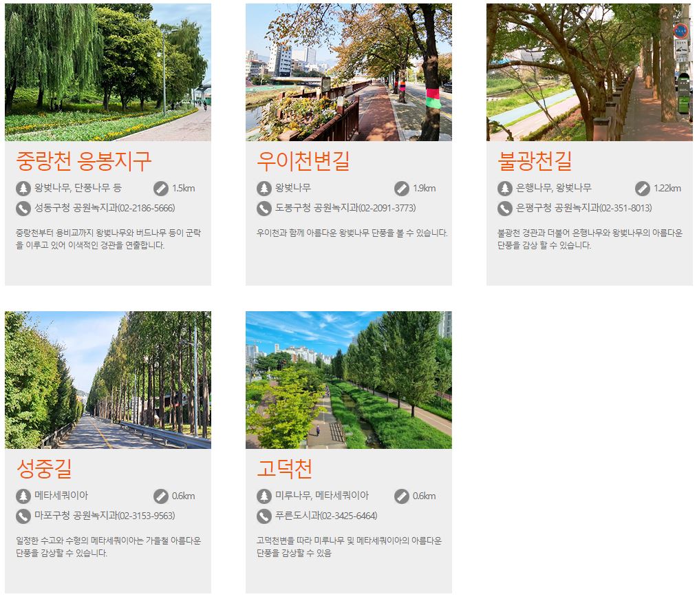북한산길 (3.5km) : 북한산국립공원과 연접한 가로로, 느티나무, 벚나무 등 갖가지 단풍을 즐길 수 있습니다.
