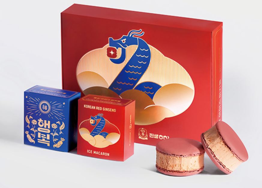 홍삼 선물세트가 식상했다면 홍삼 아이스 마카롱은 어떨까요? 라라스윗과 콜라보한 이번 제품은 정관장 6년 근 홍삼 농축액을 넣은 아이스 마카롱입니다. 청룡의 해를 맞아 귀여운 청룡 일러스트 패키지에 담겨 있어 선물하기에도 좋은 제품이죠.