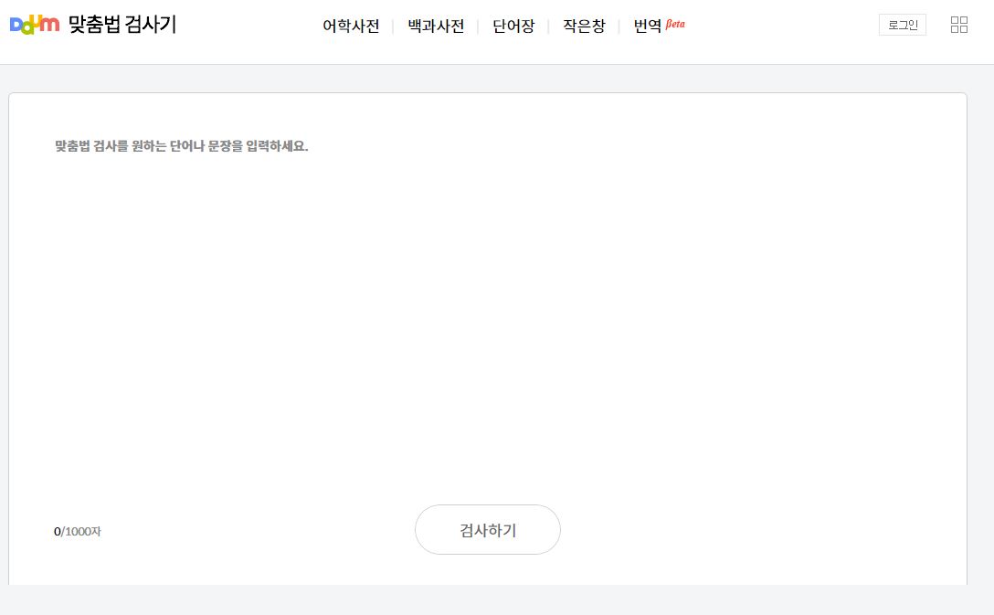 다음에서 제공하는 맞춤법 검사기입니다. 작업 속도도 매우 빠르고 수정된 교정문을 바로 복사할 수 있어 작업하기 효율적입니다. 다면 1000자 미만이라 긴 글을 쓴 경우 글자수에 맞춰 나눠서 작업해야 하는 불편함이 있습니다.
