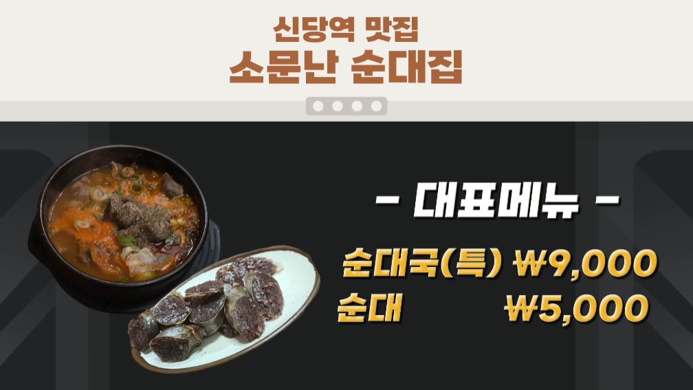 대표메뉴 : 순댓국(특) 순대 9,000원 / 순대 5,000원