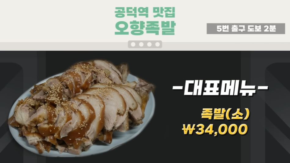 오향족발은 공덕시장 족발골목에서 40년 넘게 운영한 곳으로 가게에서 직접 삶아낸 족발을 맛볼 수 있는데요. 특히 족발을 시키면 사이즈와 상관없이 떡볶이, 순대, 순댓국을 서비스로 내어주어 더욱 푸짐한 한 끼를 즐길 수 있죠. 다만 평일에는 웨이팅이 심할 수 있다고 하네요.