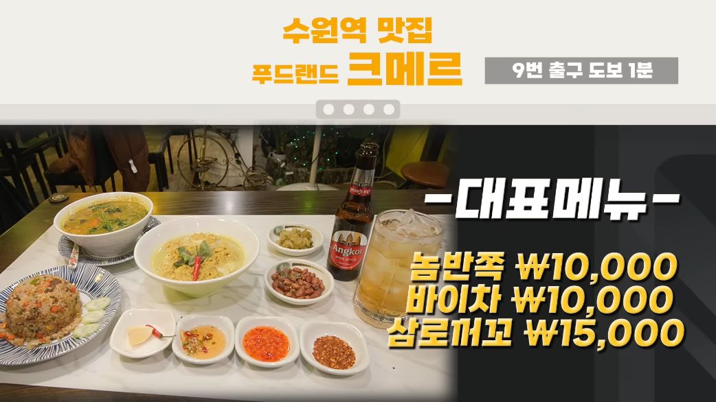 수원역 9번 출구에 위치한 크메르는 '다문화 푸드랜드' 안에 위치한 캄보디아 음식점인데요. 현지인들이 직접 운영하여 찐 칸보디아의 맛을 제대로 느낄 수 있답니다.