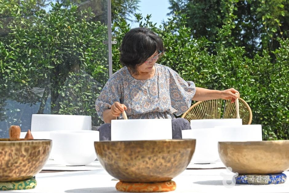 제원하늘농원은 2만 8000㎡(8470평)의 노지와 8300㎡(2510평)의 하우스를 갖춘 감귤농원이다. 농림축산식품부의 ‘무농약’ ‘GAP’ ‘저탄소’ 인증을 받은 제원하늘농원은 2022년 싱잉볼 명상과 푸드테라피를 접목한 치유농원으로 거듭났다. 제원하늘농원의 대표 웰니스 프로그램은 싱잉볼 명상이다. 농원 입구에서 산책로를 따라 10분쯤 걸어가면 블로비(Blobee)라 부르는 돔 형태의 구조물이 모습을 드러내는데, 이곳에서 싱잉볼 명상이 진행된다. 호텔 루프톱, 유리온실 등으로 활용되는 블로비는 전체가 투명한 소재로 되어 있어 인공 구조물이지만 주변과 이질감 없이 어우러진다.