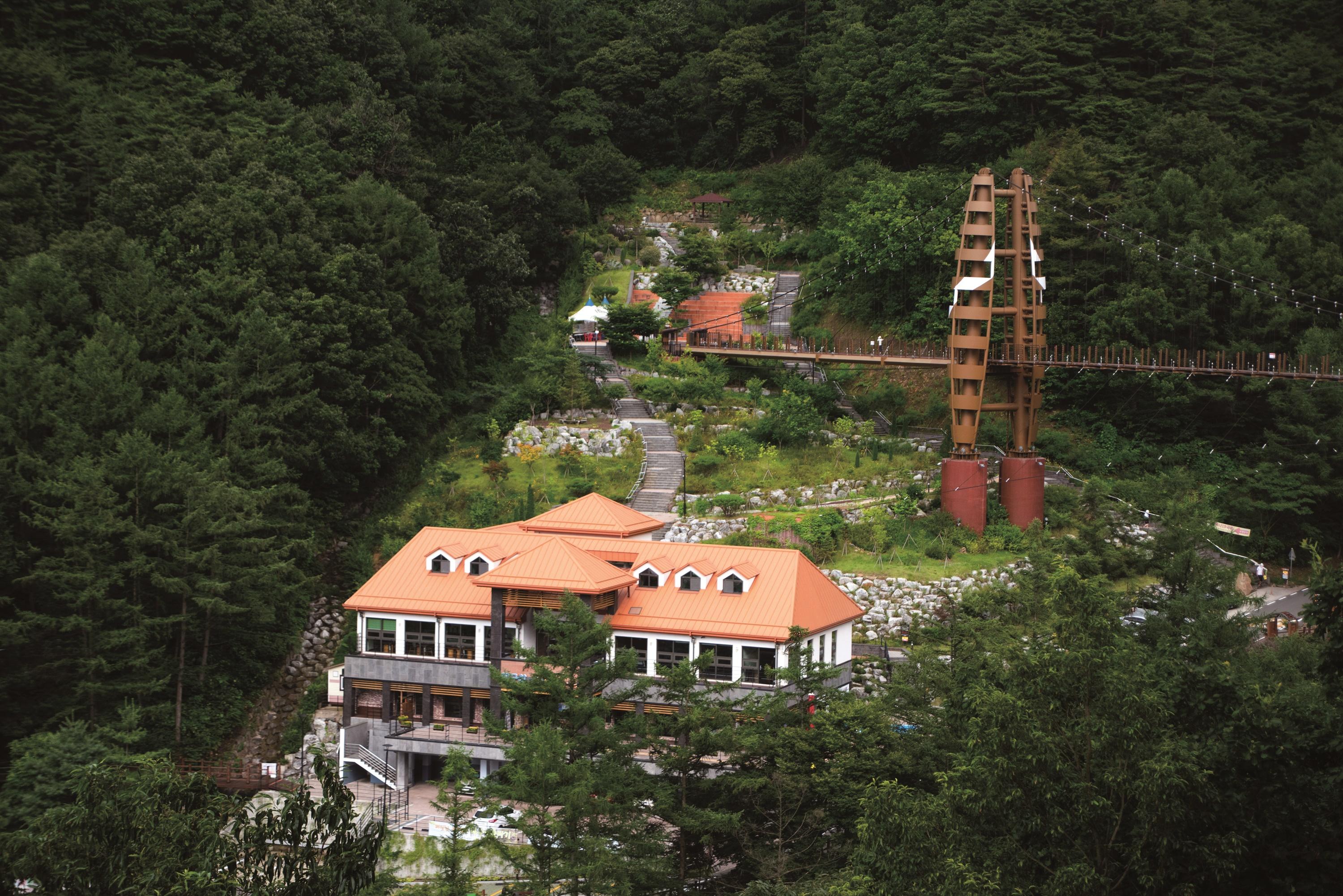 동해무릉건강숲은 입구부터 남다르다. 무릉계곡 입구의 다리를 건너야 하는데 아래가 훤히 보이는 스카이워크 형태다. 수십 미터 아래 계곡물이 흐르는 풍광을 내려다보며 다리를 건너면 2만 4207㎥ 규모로 119억 원을 투입해 만든 최신 웰니스 관광지가 모습을 드러낸다. 동해시가 직접 운영해 부담 없는 가격으로 웰니스 체험이 가능한 것이 가장 큰 장점이며 숙박과 식사, 체험 프로그램을 원스톱으로 즐길 수 있다는 것이 특징이다.