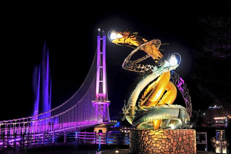 예산 10경 중 하나인 예당호에는 거대한 황새가 호수 위를 비상하는 모습을 형상화한 402m 길이의 출렁다리가 있는데요. 다리 중간에는 탁 트인 풍경과 함께 예당호를 한눈에 담을 수 있는 전망대가 있고 다리를 끝까지 건너면 용이 승천하는 듯한 쌍용 조형물을 만나볼 수 있습니다. 특히, 해가 지고 방문하게 된다면 알록달록한 빛으로 물든 출렁다리를 배경으로 용과 함께 예쁜 사진을 찍어 남길 수 있다는 사실!
