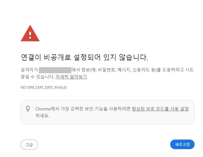 위 알림창과 함께 주소창에 https에 빨간 줄이 쳐져 있고 접속이 되지 않는 경우