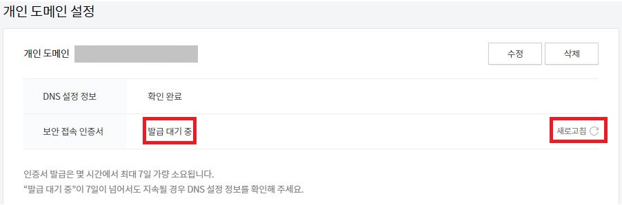 3-2 개인 도메인 삭제 - 도메인 연결하기 - 보안 접속 인증서 발급 완료 기다리기 (최대 7일 소요)
