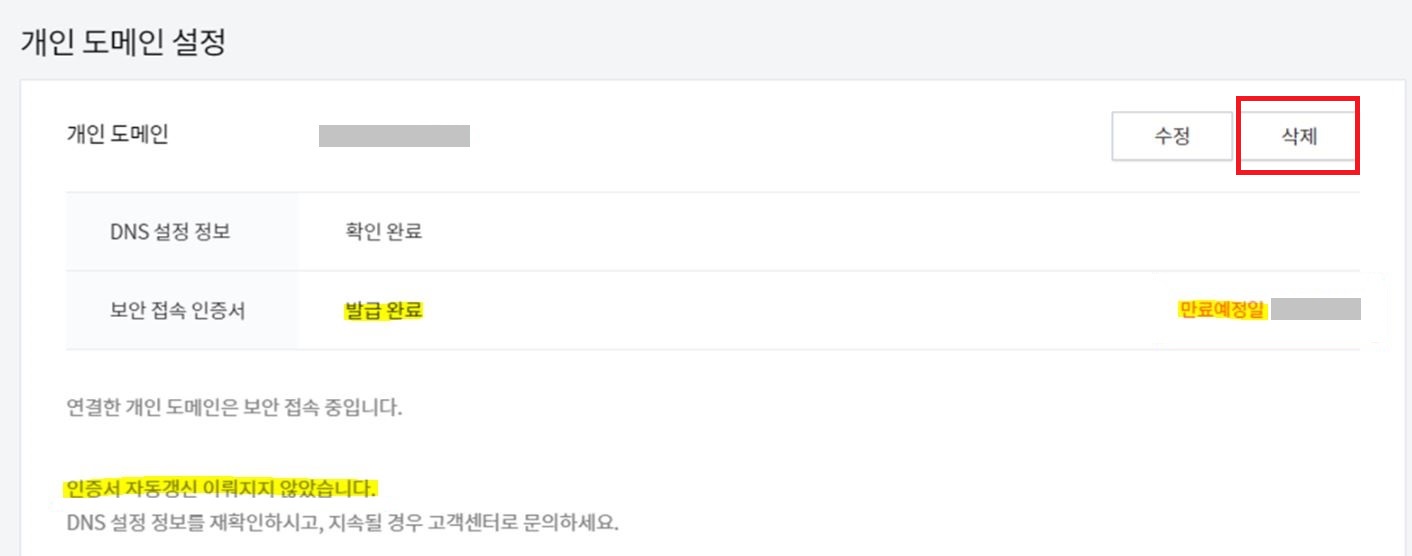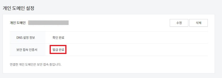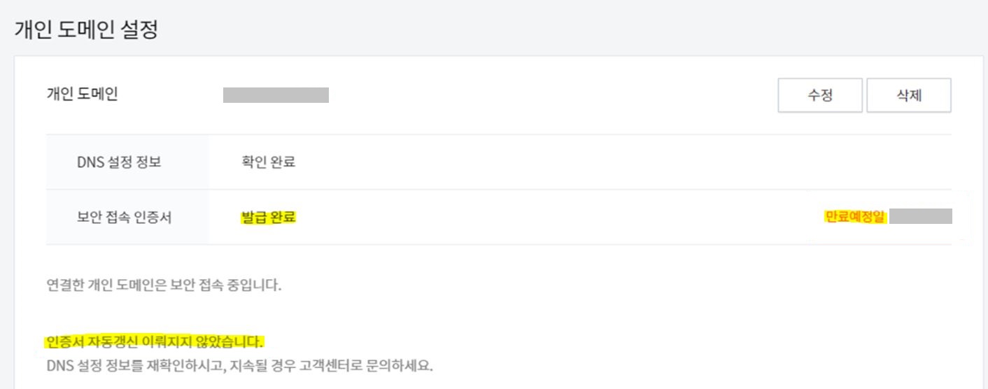 개인 도메인 설정 부분을 보면 '보안 접속 인증서' 부분이 '발급 완료'로 되어 있으나 우측 만료예정일이 보이실 겁니다.