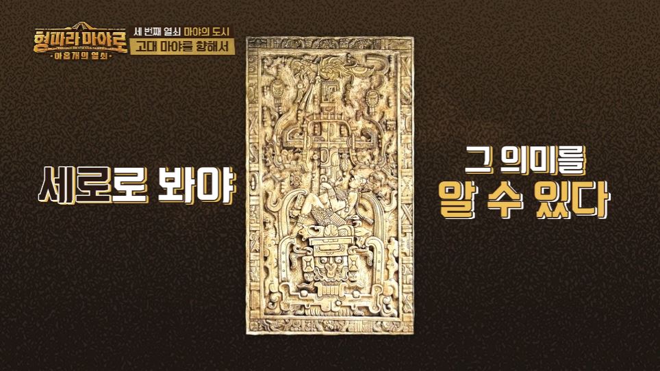세로로 보면 그 의미를 알 수 있다고 하는데요. 인간 세상과 사후 세계가 이어진 마야인의 세계관을 나타내는 신성한 나무가 가운데에 있고 아래에는 입을 벌리고 있는 죽음의 뱀, 그리고 그 사이에 제단에 바쳐진 듯 표현된 빠깔 왕의 모습을 확인할 수 있습니다. 마야 문명에 대한 이야기는 늘 들어도 흥미로운 것 같네요.