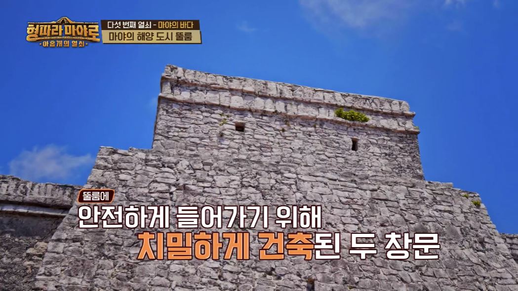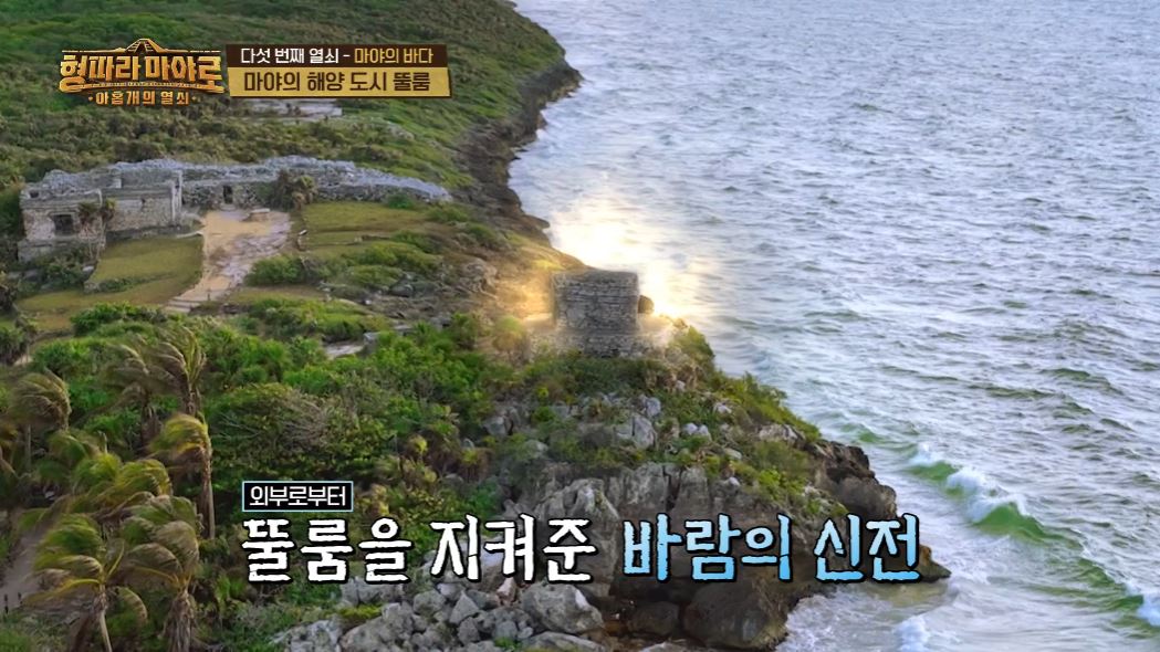 제일 처음 소개된 곳은 바닷가 절벽 바로 앞에 위치한 '바람의 신전'입니다. 바닷가에 위치하다보니 툴룸은 자연재해, 특히 허리케인이나 태풍의 위험을 많이 받았는데요. 태풍으로 바람이 강하게 불면 바람의 신전에서 휘파람 소리를 들을 수 있다고 합니다.(강한 바람이 창을 통해 지나가면서 내는 소리) 휘파람 소리가 들리면 동굴로 대피해 위험에 대비했다고 하네요.