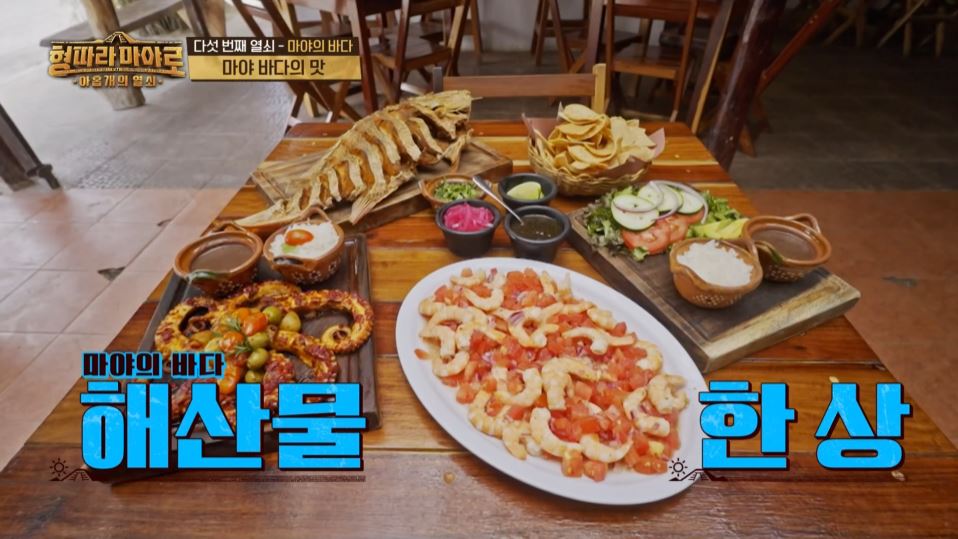 멤버들은 새우 타코, 문어 플래터, 세비체, 생선튀김 등을 주문해서 먹었는데요. 이중 가운데 있는 세비체는 생선이나 해산물을 얇게 떠서 레몬 즙이나 라임즙, 향신채에 재워 먹는 요리라고 하네요. (멤버들이 먹은 건 새우 세비체)