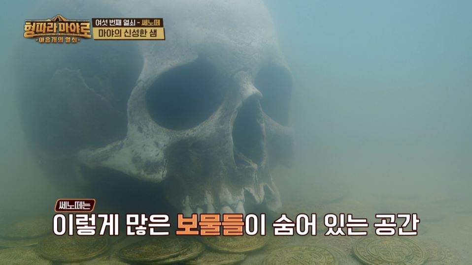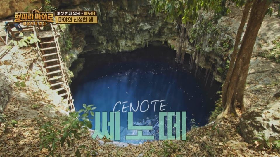 다섯 번째 열쇠 '마야의 바다'를 획득한 멤버들이 다음으로 찾아볼 주제는 바로 '마야의 신성한 샘, 쎄노떼'입니다. 쎄노떼(Cenote)는 멕시코의 유카탄 반도 일대에서 볼 수 있는 카르스트 지형의 하나로, 석회암 암반이 비나 지하수에 의한 침식 작용으로 녹아내려 만들어진 천연 우물이라고 합니다.