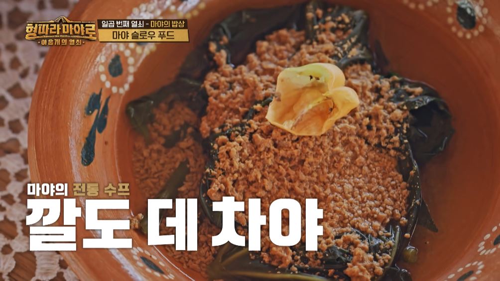다음으로 소개된 음식은 '깔도 데 차야'입니다. 차야라는 부드러운 잎이 들어간 수프로 우리나라 아욱국과 비슷한 느낌이라고 하네요. 수프는 기호에 맞춰 호박씨 가루, 라임즙을 뿌려 먹는다고 합니다. (우리나라 들깻가루 같은 느낌일까요?)