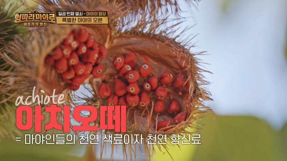 들어가는 향신료 중 아치오떼(achiote)는 천연 색료이자 천연 향신료로 고기 잡내 제거에 매우 효과적이라고 하죠. 그렇게 갈아낸 향신료에 돼지기름, 설탕, 오렌지 즙을 넣고 만든 소스를 돼지고기에 발라 바나나 잎이 깔린 냄비에 담아주고 양파와 토마토를 얇게 썰어 얹어준 뒤 바나나 잎을 덮고 피브에 넣어 24시간 동안 푹 익혀주면 완성됩니다. (멤버들 말로는 우리나라 감자탕 속 고기랑 비슷한 느낌이라고 하네요)