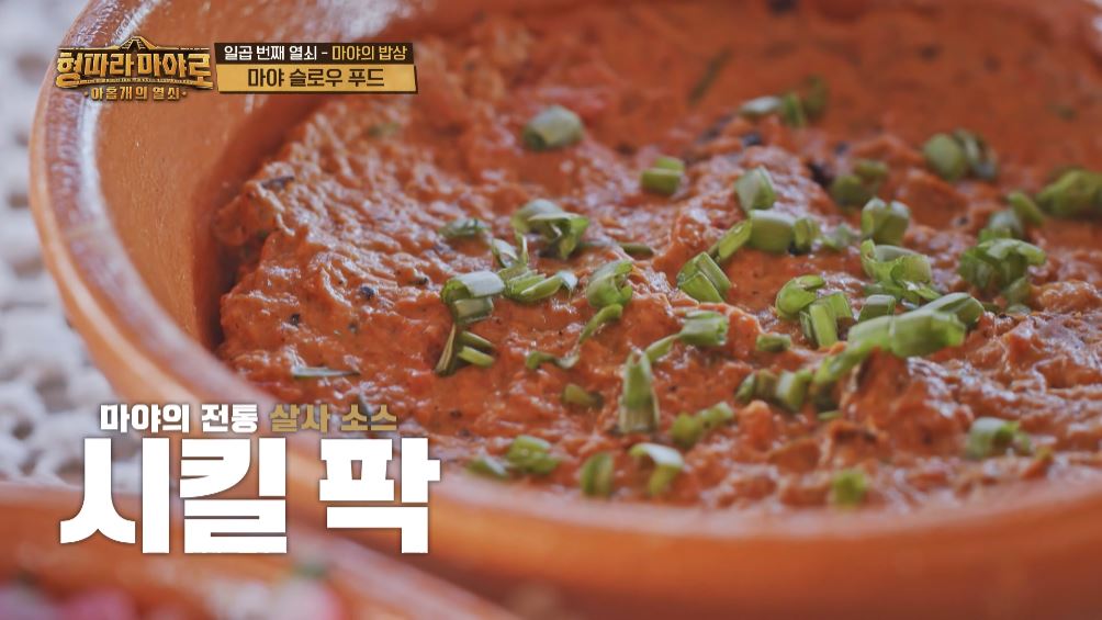 다음으로 소개된 것은 '시킬 팍'입니다. 음식이라기보다 나초에 찍어 먹는 살사 소스인데요. 익힌 토마토를 으깨 잘게 썬 쪽파, 호박씨 가루를 넣고 잘 섞어주면 완성됩니다. 고소하고 담백한 맛이 특징이라고 하네요.