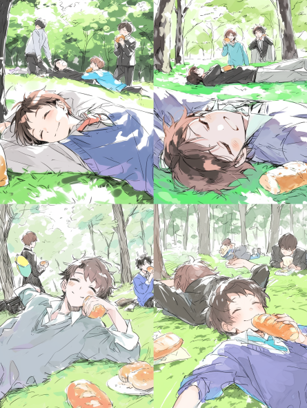 a scene of a schoolboy idol group lying on the forest lawn, Japanes anime style. First member with short brown hair in school uniform, second member with short black hair, black uniform. 3rd member with short brown hair, smile. 4th member with blue sweater, short black hair, eating bread. Created Using : vibrant colors, dynamic poses, detailed anime characters, soft lighting, wide angle, hd quality, natural look, style of morikura en, official artwort, --sref https://s.mj.run/7faAaIZPzw0 https://s.mj.run/Ye5Tg6Dwbm0 https://s.mj.run/q6Af1w1wjC4 --niji 6 --style raw --no text --ar 3:4