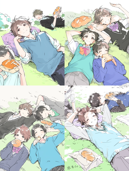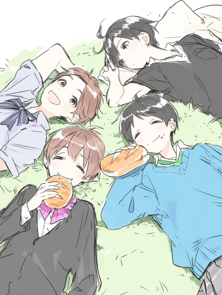 a scene of A boy idol group lying on the lawn together, Japanes anime style. First member with short brown hair in school uniform, second member with short black hair, black uniform. 3rd member with short brown hair, smile. 4th member with blue sweater, short black hair, eating bread. Created Using : vibrant colors, dynamic poses, detailed anime characters, soft lighting, wide angle, hd quality, natural look, style of morikura en, official artwort, --sref https://s.mj.run/7faAaIZPzw0 https://s.mj.run/Ye5Tg6Dwbm0 https://s.mj.run/q6Af1w1wjC4 --niji 6 --style raw --no text --ar 3:4