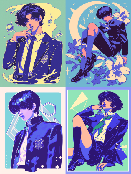 a boy with school uniform, Japanes anime style. Created Using : blue colors, detailed anime characters, hd quality, --sref https://s.mj.run/ii6UHG8aK0c --style raw --no text --ar 3:4 --niji 6