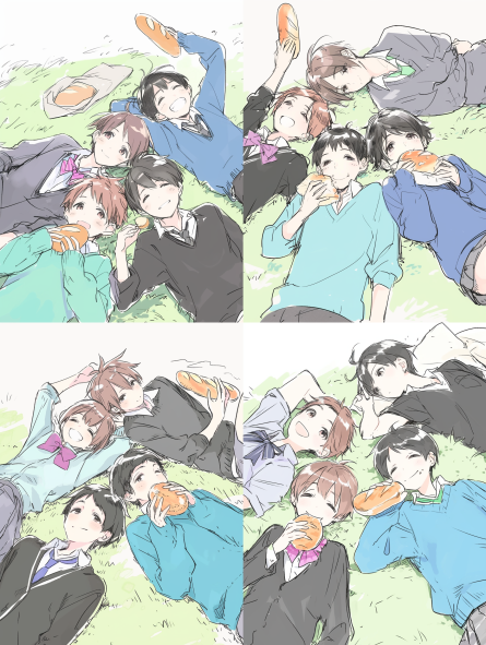 a scene of A boy idol group lying on the lawn together, Japanes anime style. First member with short brown hair in school uniform, second member with short black hair, black uniform. 3rd member with short brown hair, smile. 4th member with blue sweater, short black hair, eating bread. Created Using : vibrant colors, dynamic poses, detailed anime characters, soft lighting, wide angle, hd quality, natural look, style of morikura en, official artwort, --sref https://s.mj.run/7faAaIZPzw0 https://s.mj.run/Ye5Tg6Dwbm0 https://s.mj.run/q6Af1w1wjC4 --niji 6 --style raw --no text --ar 3:4