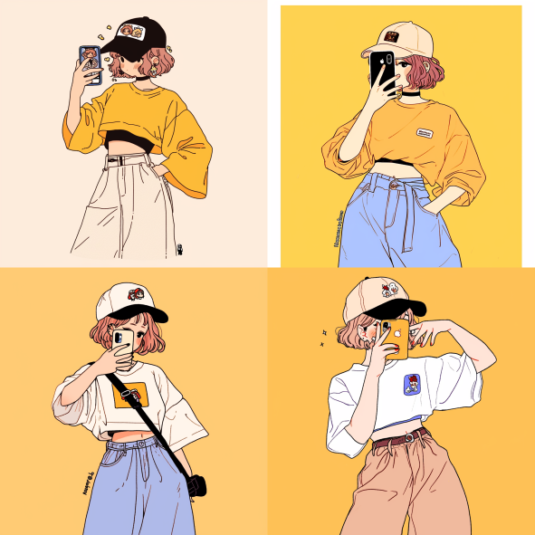 a girl wearing wide pants, a cropped shirt, short pink hair, and a baseball cap. taking a selfie with iphone. Created Using : vibrant colors, dynamic poses, detailed anime characters, hd quality, --sref https://s.mj.run/e4kJQ_9YHTY https://s.mj.run/GolalTbayng https://s.mj.run/e0kKm2Trjco --style raw --no text --ar 1:1 --niji 6