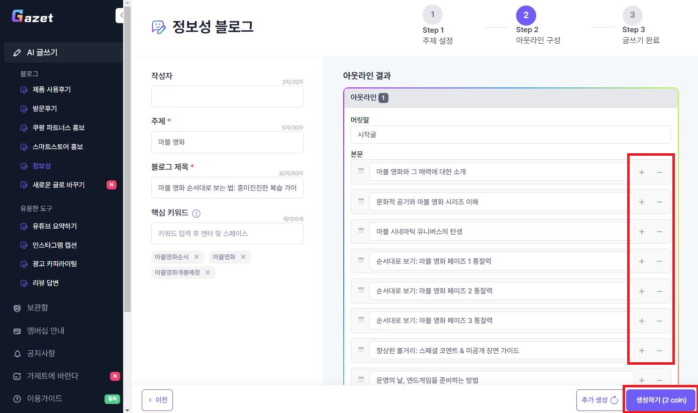 키워드까지 입력 후 '목차 생성'을 누르면 이렇게 아웃라인을 구성해 줍니다. 블로그의 대략적인 플로우를 정리하는 것이죠. 여기에서 빼고 싶은 항목과 추가하고 싶은 항목을 선택해 주면 됩니다. 이후 '생성하기'를 누르면 끝! 단, 생성하기를 클릭하면 코인(금액)을 소모하게 되니 신중히 입력 후 눌러주세요.