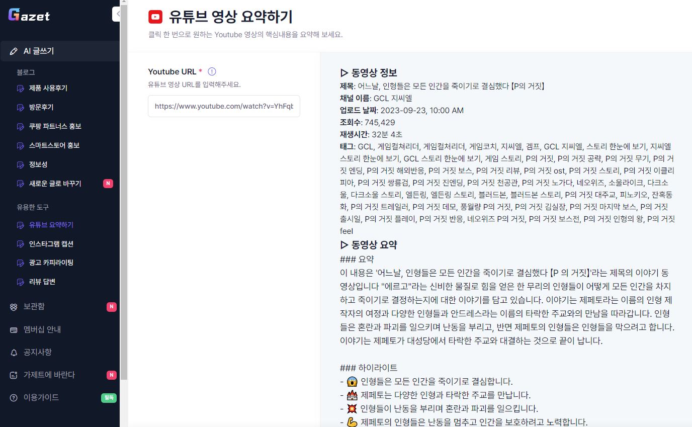 기존 AI 사이트에서 보지 못했던 새로운 기능들이 궁금해 이번에는 '유튜브 영상 요약하기'를 선택해 봤습니다. 예능이나 짧은 숏츠 영상을 요약하기보다 긴 영상을 어떻게 요약해 낼지 궁금해 30분 분량의 게임스토리 요약 영상을 링크에 넣어봤습니다.