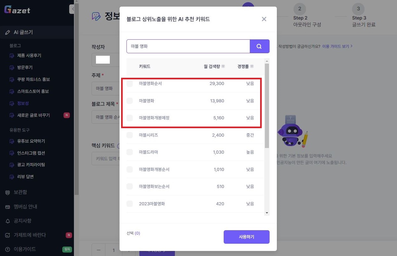 개인적으로 다른 글쓰기 AI 사이트에 비해 요 부분이 참 흥미로웠습니다. 검색 시 주제로 잡은 키워드를 기준으로 검색량이 높고 경쟁률이 낮은 키워드를 추천해 주는데요. 글쓰기 도움을 받지 않아도 키워드 추천은 이후에도 도움이 되겠다는 생각이 드네요. 일단 가장 상단에 있는 3가지 키워드를 선택했습니다.