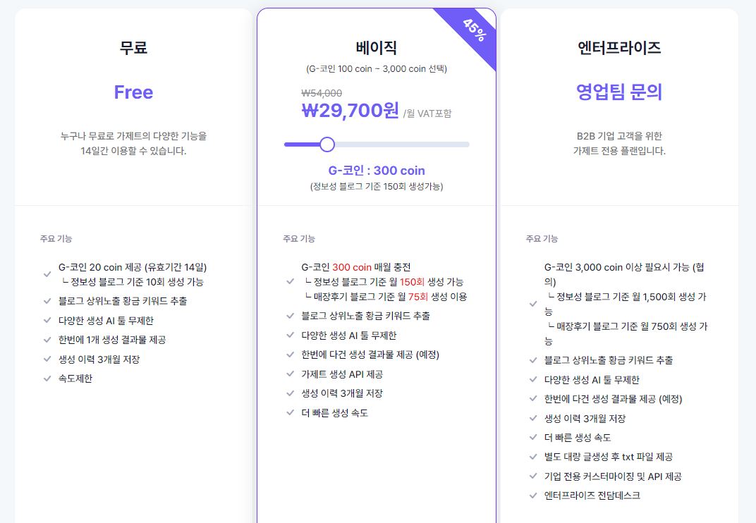 가제트 ai는 현재 기본 월정액 요금제를 제공하고 있습니다. 무료로도 사용이 가능하지만 딱 14일 간만 체험이 가능하죠. 지금은 오픈 초반이라 45% 할인 중이기는 하나 기본 금액이 월 5만 4천 원으로 생각하면 꽤 큰 금액인 것 같네요. 글쓰기가 처음이시거나 글의 전체적인 플로우를 잡는 게 어려우신 분들이라면 한 번쯤은 체험해 보시는 걸 추천드립니다.