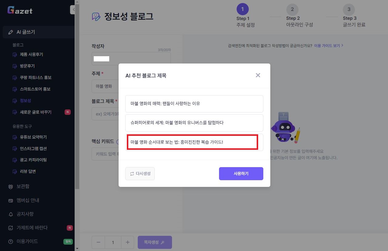 추천을 클릭하면 3가지 제목을 추천해 줍니다. 제목이 모두 마음에 들지 않으면 '다시 생성'을 클릭하면 되는데요. 저는 3개지 추천 제목 중 '마블 영화 순서대로 보는 법 : 흥미진진한 복습 가이드!'를 선택해 보겠습니다.