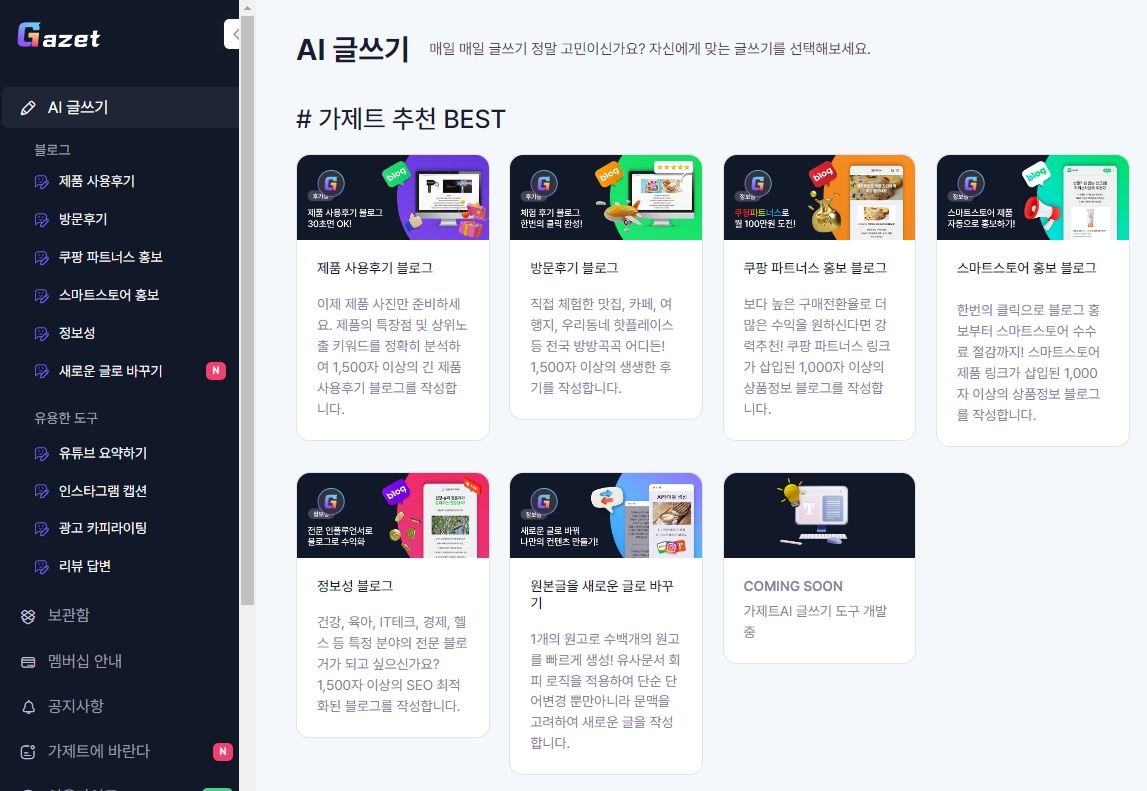 챗GPT를 시작으로 AI(인공지능) 활용에 대한 관심이 점점 높아지고 있는 요즘, 글쓰기에 특화된 AI 서비스인 '가제트 AI'가 화제로 떠오르고 있는데요. 블로그 주제로 주로 사용되는 제품 사용 후기, 방문 후기, 스토어 홍보, 정보성 글 등 다양한 글쓰기 서비스를 제공하고 있죠. 글 쓰는 게 취미이자 업인 저로써는 흥미로운 주제이다 보니 이번 포스팅에서는 가제트 ai 서비스를 직접 체험해보려고 합니다.