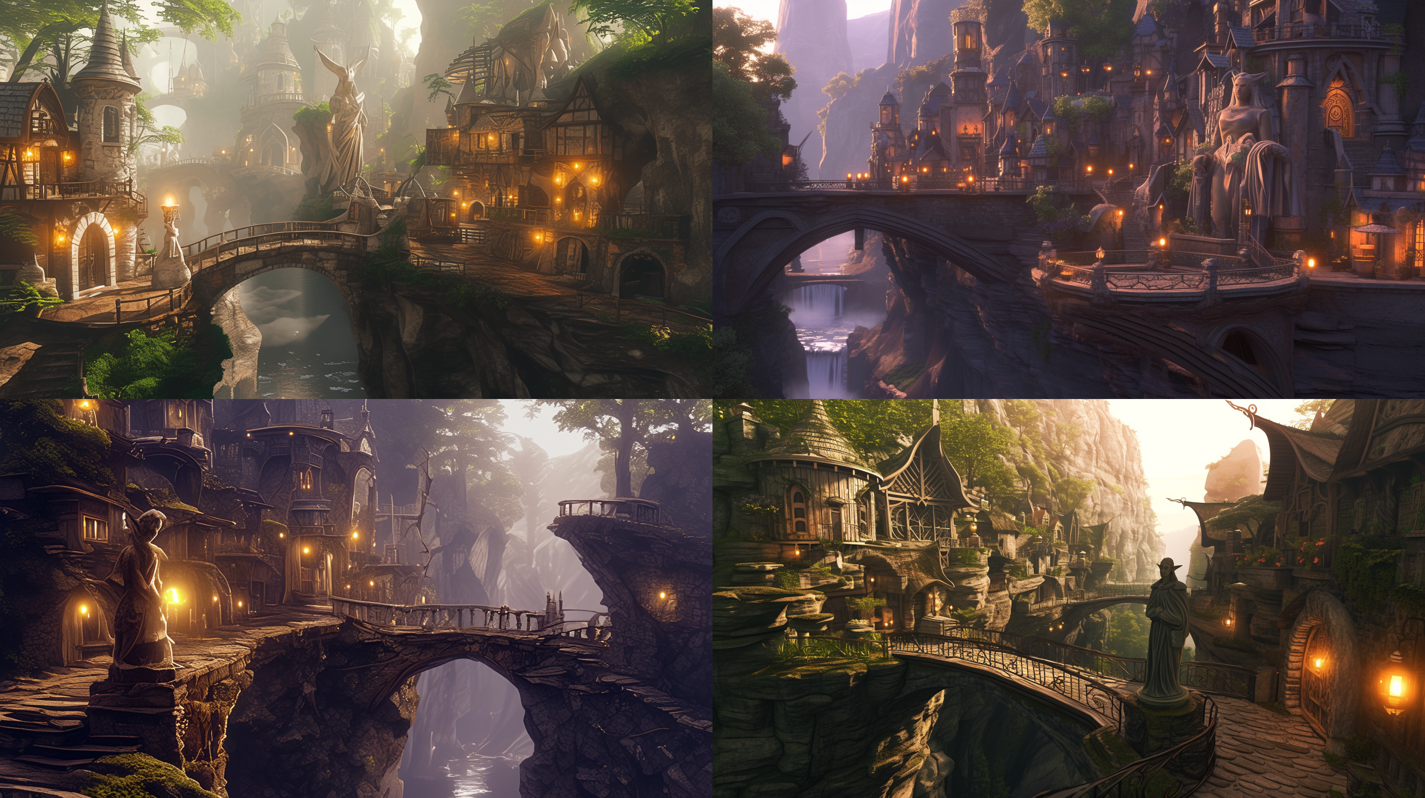/imagine an morning scene in an elf village on a cliff, quaint stone structures, bridges, fantasy statue, elven architecture, picturesque, beautiful, fantasy, quiet, empty, dimly lit, warm lights --style raw --ar 16:9 --no text --niji 6
