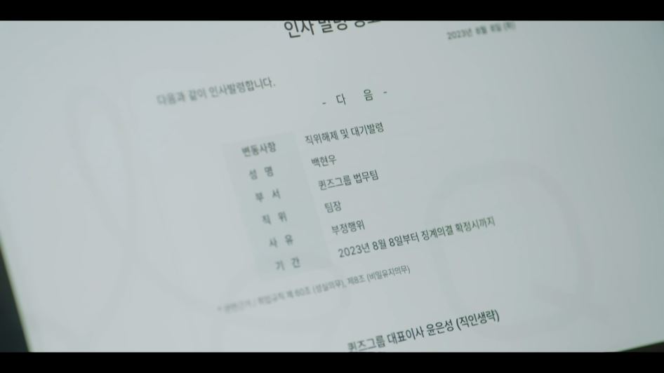 회사로 출근한 현우는 부정해위를 근거로 직위 해제 및 대기 발령 되었다는 공고문을 받게 됩니다. 은성은 현우에게 없는 죄를 뒤집어 씌울 계획이었죠. 현우는 화가 나지만 묵묵히 이를 받아들입니다.